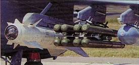 Под левой плоскостью крыла штурмовика Су-25Т подвешены. слева направо: УР воздух-поверхность Х-25МЛ с полуактивным лазерным наведением (дальность полета 20 км. масса боевой части 90 кг), блок 122-мм НАР Б- 13Д, УР воздух-воздух ближнего радиуса действия Р-60 (массо-габаритный макет).