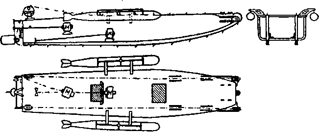 винт, другой, 15-сильный, — гусеницы. Поэтому через заграждения можно было перелезать подобно танку. К месту операции это сооружение предполагалось доставлять на буксире миноносцем, далее со скоростью 4 узла по воде его перемещал электродвигатель, а боны преодолевались на гусеницах.