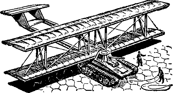 Кристи, эта конструкция была явно удачнее. В отличие от американского проекта, где танк носил на себе неотделяе-мые крылья, Т-60 после посадки мгновенно освобождался от планера (экипажу даже не требовалось покидать машину) и действовал без лишней нагрузки, стеснявшей его маневры. Самое же оригинальное заключалось в том, что планер вместе с танком поднимался в воздух за самолетом-буксировщиком, набирал нужную высоту, отцеплялся, а затем следовал к цели самостоятельно и совершал посадку. Естественно, от командира требовалось владеть сразу двумя профессиями — танкиста и планериста. Сам планер представлял собой биплан весом около 4,5 т, имевший размах крыла около 30 м. К бипланной коробке на двух балках крепилось двухкилевое вертикальное оперение, а между ним было горизонтальное, тоже бипланного типа. Планер крепился на танке специальными зажимами. Взлет и посадка осуществлялись на танковое шасси.