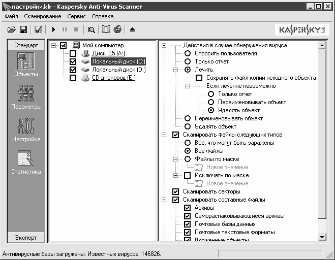 Параметры сканирования устанавливаются в настройках программы. В частности, там указываются объекты, которые нужно проверить, определяется порядок действия в случае обнаружения вируса (переименовать зараженный объект, удалить его либо вылечить, или поместить в указанную папку), устанавливается количество ресурсов компьютера, выделяемых на сканирование, и др.