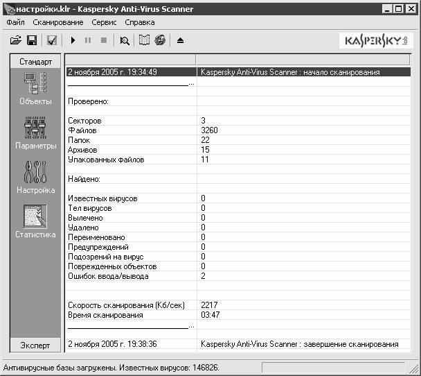Модуль Kaspersky Anti-Virus Scanner предназначен для сканирования компьютера (либо указанных объектов) на предмет заражения вирусами. Для вызова этого модуля можно использовать ярлык на рабочем столе либо соответствующую команду, которая после установки программы появится в меню кнопки Пуск. Также Kaspersky Anti-Virus Scanner будет доступен в контекстном меню, которое вызывается нажатием правой кнопки мыши в окне Проводника при выделении курсором какой-либо папки или файла. Это очень удобно, когда необходимо быстро просканировать какой-либо объект, поскольку избавляет пользователя от необходимости вызывать интерфейс программы и указывать в настройках сканируемый объект.