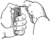 Удерживая корпус магазина в левой руке так, чтобы выступ для крепления магазина был вверху и слева; правой рукой вложить подаватель в корпус магазина. Вставить в корпус магазина пружину подавателя отогнутым концом вверх и вправо и, поджимая пружину большим пальцем левой руки (рис. 25), правой рукой надвинуть крышку на загнутые ребра корпуса так, чтобы отогнутый конец пружины заскочил в отверстие крышки.