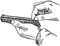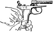 Удерживая рамку за основание рукоятки левой рукой и повернув спусковой крючок в переднее положение, правой рукой наклонить курок головкой вперед, ввести его цапфы в цапфенные гнезда в рамке (рис. 28) и повернуть головку курка назад.