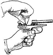 Повернуть пистолет так, чтобы задняя стенка основания рукоятки была обращена к себе, и, придерживая большим пальцем левой руки боевую пружину за защелку магазина, а указательным переднюю стенку основания рукоятки, большим и указательным пальцами правой руки надеть задвижку боевой пружины (рис. 30).