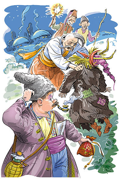 «Нет, ты не ускользнёшь от меня!» — кричал голова, таща за руку человека в вывороченном шерстью вверх овчинном чёрном тулупе. Винокур, пользуясь временем, подбежал, чтобы посмотреть в лицо этому нарушителю спокойствия, но с робостию попятился назад, увидевши длинную бороду и страшно размалёванную рожу. «Нет, ты не ускользнёшь от меня!»- кричал голова, продолжая тащить своего пленника прямо в сени, который, не оказывая никакого сопротивления, спокойно следовал за ним, как будто в свою хату.