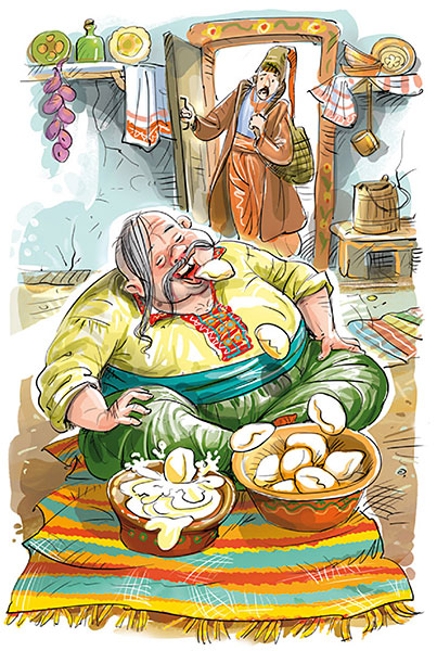Только что он успел это подумать, Пацюк разинул рот, поглядел на вареники и ещё сильнее разинул рот. В это время вареник выплеснул из миски, шлёпнулся в сметану, перевернулся на другую сторону, подскочил вверх и как раз попал ему в рот. Пацюк съел и снова разинул рот, и вареник таким же порядком отправился снова. На себя только принимал он труд жевать и проглатывать.