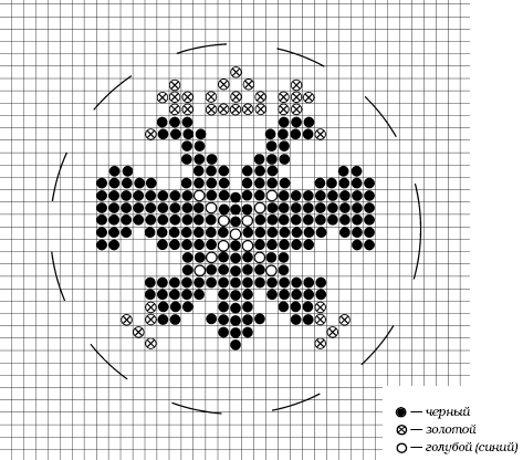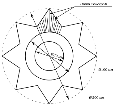 Вышив двуглавого орла, мы определились в размере малого медальона, который зависит от размера бисера и клетки канвы. В нашем случае это круг диаметром 60 мм. Размер внутреннего медальона диктует нам размеры остальных деталей: размер большого медальона будет равен, согласно пропорции, 100 мм, а размер восьмиконечной звезды – 200 мм. Звезду можно начертить в круге диаметром 200 мм самим или воспользоваться рисунком.