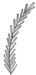 Этим швом можно вышивать ветки елки или колосья пшеницы, а можно его использовать просто при создании декоративной веточки. Вышивать можно как бисером, набирая на иглу с ниткой несколько бисерин (например, по пять), так и стеклярусом, набирая на иглу по одному стеклярусу. Естественно, что, чем длиннее используемый при вышивании стеклярус, тем больше будет вышиваемая ветка.