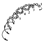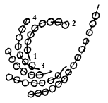 Если вы выполняете не дугу, а завиток, то его утолщение делается по краю завитка. Первая связка состоит, например, из восьми бисерин (связка 1–2). Далее выйдите иглой в точку 3 и выполните связку 3–4. Затем укладываете связки более наклонно, подобно завитку.