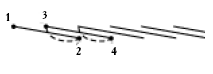 От исходной точки 1 нитку сначала продвигают вперед, затем, делая стежок 1–2, проколов ткань, иглу с рабочей ниткой проводят по изнаночной стороне назад, выводя у середины предыдущего стежка 3–4 на расстояние, равное первому стежку. Образуется непрерывный ряд стежков одинаковой величины. Рабочую нитку следует выводить всегда с одной стороны стежков.
