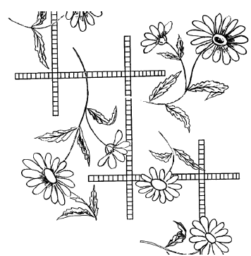 Такой рисунок мы переводим на ткань. Он состоит из линий, овалов и крестиков. Линии – это стебли, овалы – венчики ромашек, а крестики и точки – места вышивания незабудок и их бутонов