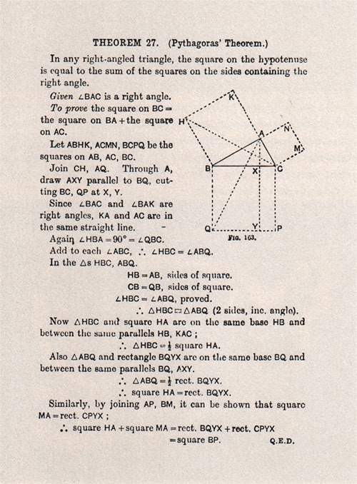 А вот визуальное представление той же теоремы. Руари Маклин назвал книгу Бирна “одной из самых странных и красивых книг 19-го столетия… бесспорное усложнение Евклида, но и издательский триумф Чарльза Витхэма”. Однако, при ближайшем рассмотрении становится понятно, что по меньшей мере для определенной группы читателей бирновское представление вносит ясность в неочевидные и запутанные изыскания Евклида.