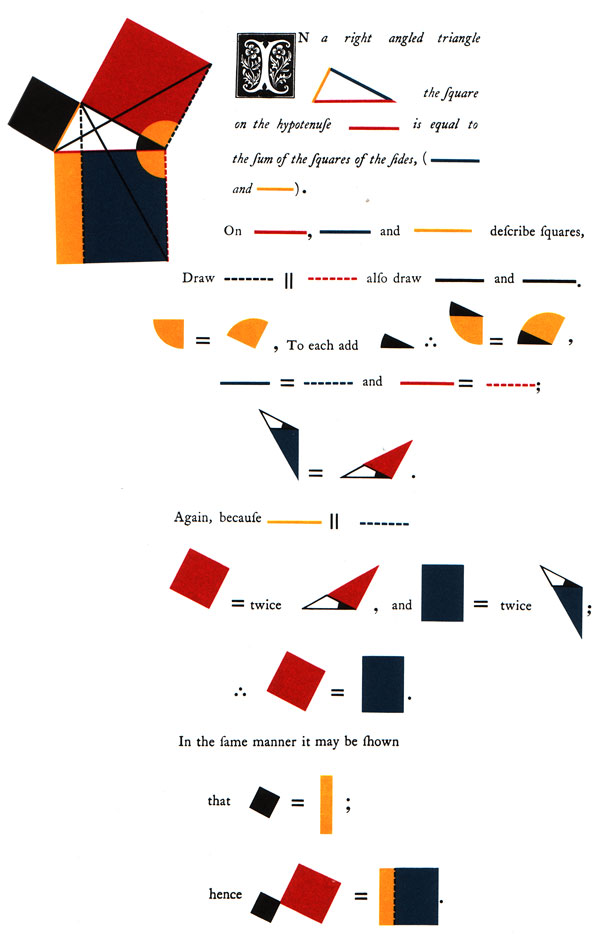 Очень достойная работа с цветом в переиздании первых шести книг “Начал” Евклида под редакцией Оливера Бирна в 1847 году. Истинный визуал, Бирн отказывается от традиционного в геометрии буквенного обозначения. Каждый элемент однозначно определяется по форме, цвету и положению на плоскости — вместо того, чтобы толковать об угле DEF, угол этот показани для геометрии вполне убедительно (ведь мы ведем беседу в области геометрии, не так ли?). Ниже приведена традиционная страница с доказательством теоремы Пифагора, в рисунке использовано 63 обозначения — это же сколько надо потратить времени, чтобы все это прочесть и все нужные связи у себя в голове установить.