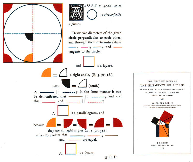 Ниже инструкция как построить квадрат на основе круга с типичным эвклидовым доказательством того, что построенная фигура действительно окажется квадратом. Цвет тут выполняет информативную функцию. Бирн использует всего навсего четыре простых цвета, а ведь никакие иные четыре цвета так не отличаются друг от друга. Глубокий жёлтый контрастен белому фону, синий относительной светлый и не сливается с чёрным. Чёрный вообще используется мало, да и то только для приглушения ненужных контрастов, а на больших поверхностях — никогда. Большой интерлиньяж делает использование графических элементов в тексте органичным, легко читаемым, а также объединяет всю страницу, создавая похожие на геометрические формы линии текста (а не блоки, как при традиционном наборе).