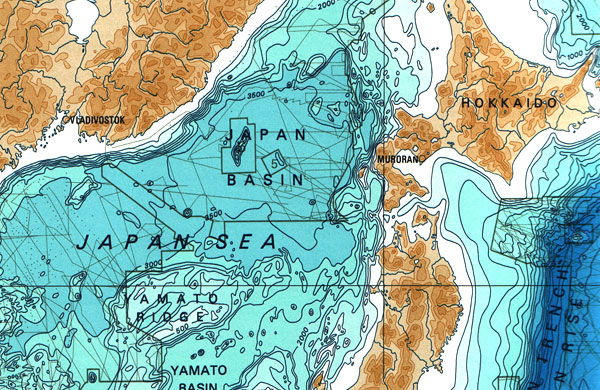 Общая батиметрическая карта океанов иллюстрирует большие океанские глубины и высоты материковой поверхности (гипсометрические отметки) в 21 шаг по принципу “чем глубше или выше, тем темнее”. На картинке ниже показаны океанические жёлобы на западе Тихого океана и в Японском море. Вокруг цветных плашек пронумерованные контуры, это упрощает чтение. Почти прозрачные серые линии вдали от глубоководных отметок — это изобаты (вне особо детализированных областей, таких как порты и прибрежные зоны). Каждая цветовая отметка на этой карте отвечает за четыре параметра: широта, долгота, море или материк и глубина или высота в метрах.