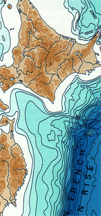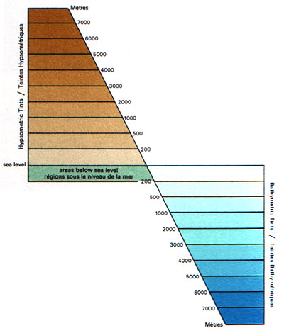 На карте океанов цветные плашки (области разной глубины) окружены контурами, на которых эти глубины подписаны. Контуры не дают близким по цвету плашкам сливаться и в целом увеличивают точность изображения.