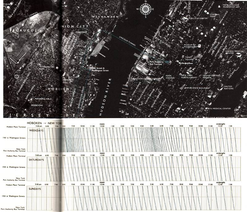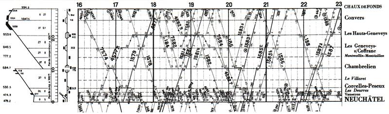 А вот более скромный пример расписания движения всего нескольких местных поездов, которые ежедневно ходили от Шо-де-Фон в 1923 году (Швейцарское железнодорожное расписание). Обратите внимание на ритмический рисунок — диагонали пересекаются только на станциях, одна линия графика означает одну железнодорожную линию и, следовательно, поезда могут обгонять друг друга только на станциях. Наглядные расписания помогают планировать такие пересечения, было бы странно представлять это каким-то иным, неграфическим, способом.