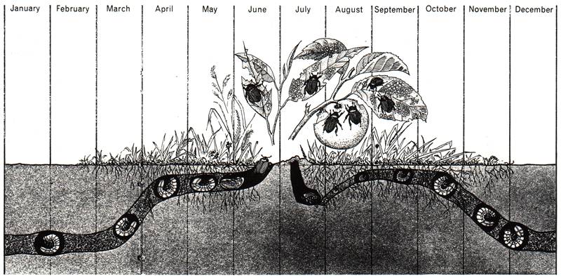 Пространственно-временная сетка изящна, гибка и универсальна. Вот очень необычный рисунок: фактически, по горизонтальной оси отмечено и пространство, и время, а по вертикальной — только пространство. Тут показан годовой жизненный цикл японского жука, причем, благодаря дублированию информации по горизонтальной оси, всей истории удается вырваться за границы плоскости.