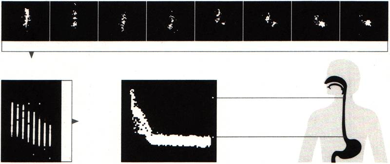 Восемь последовательных картинок показывают, как радиоактивная жидкость движется к желудку, причем только в одном измерении, боковые сдвиги не учитываются. Каждая картинка была сжата в колонку шириной в один пиксель посредством суммирования чисел по горизонтали. Все 80 картинок, полученных в результате эксперимента, были выстроены по порядку одна к одной для того, чтобы продемонстрировать глотательное движение целиком. По горизонтальной оси отложено время, 12 секунд, по вертикальной — путь ото рта до желудка. Шарик иллюстрирует незаконченное движение вниз, нормальный результат.