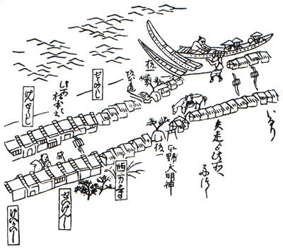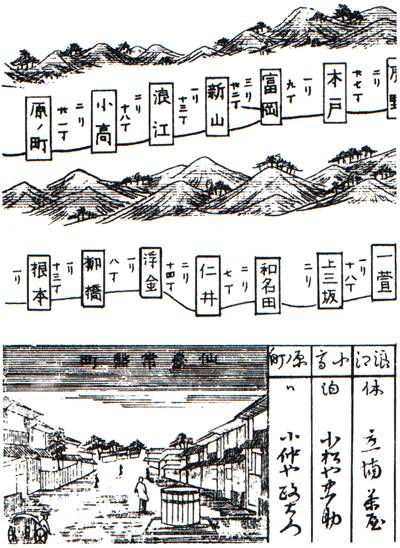 Вот пример 1868 года, на котором обозначены гостиницы, где можно остановиться и выпить чаю. В подобных путеводителях маршрут не прерывается благодаря тому, что издание горизонтального формата и страницы собраны в непрерывный связный поток. Вот ещё один горизонтально-ориентированный маршрут (1690), фрагмент из панорамы Токайдо, дорога от Киото до Эдо (Токио):