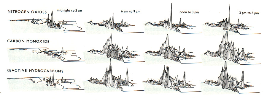Обратите внимание на то, что двумерность в этом примере срабатывает дважды. Каждая диаграмма показывает положение в двумерном пространстве некоей третьей величины, а в совокупности эти диаграммы становятся также индикаторами времени суток и типа загрязнения.