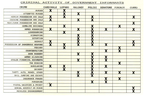 Информацию в таблице можно считывать одновременно и по вертикали, и по горизонтали, в любом случае, стройные, почти не прерывающиеся ряды крестиков серьезно портят репутацию тех, кто давал показания против мистера Готти. Например, мистер Полиси особенно отличился — напротив его имени ровный столбец крестиков. Отметки о преступлениях каждого из свидетелей беспощадны, несмотря на то, что отмечено только 37 % возможных комбинаций. Размещение наиболее тяжких преступлений в верхних (убийство) и нижних (вооруженное покушение на священника) строках подчеркивает визуальный приоритет этих областей.