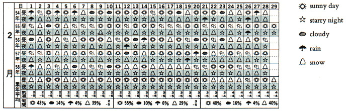 Этот прогноз погоды расширяет описанную выше технику, вводя такие сущности как город, год, месяц, день и время суток. Вот данные за пять лет ежедневной февральской погоды в городе Аомори (Япония). Нижние ряды отвечают за суммарные данные, усредненные в десятидневном периоде, пересчитывая самую часто встречающуюся погоду с 1967 по 1982 годы; средняя высокая и низкая температуры за последние 30 лет с 1951 по 1980 годы; частота солнечных, облачных и дождливых дней за последние 16 лет. В общей сложности это 414 информационных сущности, упакованных в таблицу, причем показано как усреднение, так и колебания вокруг среднего— две фундаментальных цели статистических исследований.