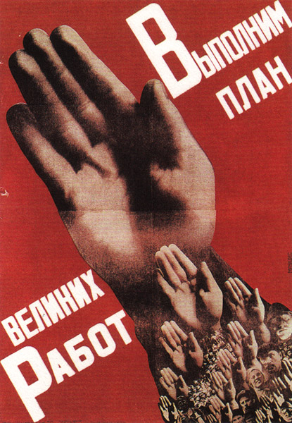 На этом известном плакате 1930-х годов (автор Густав Клуцис) для решения политической задачи используется тот же прием — комбинация сильно детализированных фрагментов и некоего обобщенного образа.