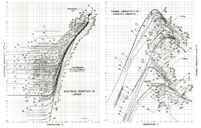 На этих многослойных графиках показана зависимость между температурой и проводимостью для различных элементов по данным измерений, сделанных в нескольких лабораториях. Каждое множество соединенных точек относится к одной публикации экспериментальных результатов, каждая публикация обозначена цифрой. Обратите внимание, как просто организованы результаты наблюдений, полученные в ходе нескольких сот экспериментов. Кроме того, гораздо легче становится сравнить разные результаты (полученные научными методами?), нередко довольно далеко отстоящие от усредненной кривой, обозначенной жирной линией с надписью recommended (“рекомендовано”). На этих графиках совершенно очевидно представление данных четырьмя слоями: отдельные точки, измеренные в ходе каждого из экспериментов, кривые, которые соединяют эти точки, и, наконец, общая конгломерация кривых (которые сравниваются со стандартной кривой).
