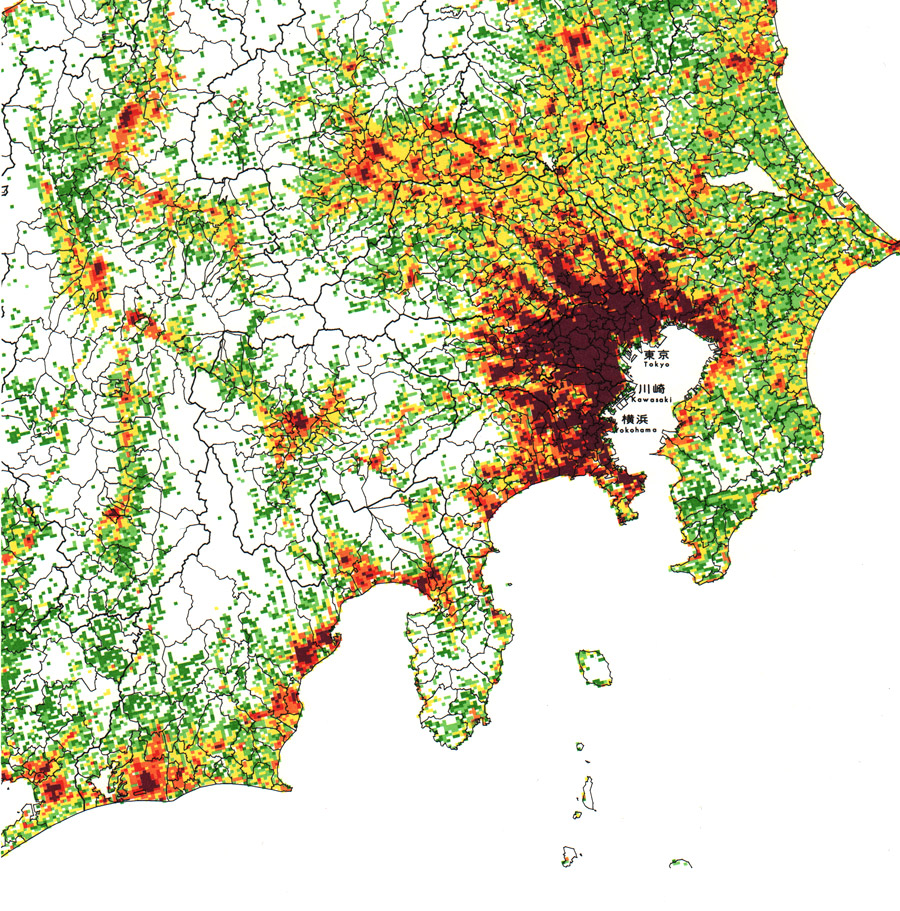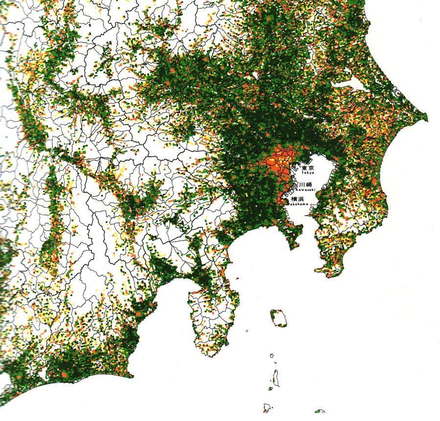 Эти необычные статистические карты разбиты на тысячи крошечных квадратиков (с длиной стороны — 1 км). Ниже на карте Токио показана плотность населения; обратите внимание на то, как ниточками расходятся темные, густонаселенные районы из центра города — люди селятся вдоль железных дорог и возле станций.