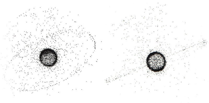 Последствия этого увеличения показаны на этих шокирующих изображениях. Большая часть мусора находится относительно близко к Земле; панорамные же виды показывают кольцо, сформированное геостационарными спутниками. Правда, на этом рисунке не показаны около 50 000 объектов диаметром меньше 10 см и десятки хреналлионов мельчайших частиц.