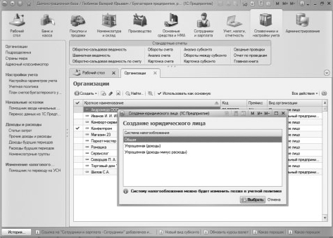 Теперь, работая в справочнике Организации , создадим запись о новой организации, нажав на кнопку Создать и выбрав в появившемся меню пункт Юридическое лицо . Далее, в появившемся окне Создание юридического лица выберем общую систему налогообложения и нажмём на кнопку Выбрать , рис. 3.2.