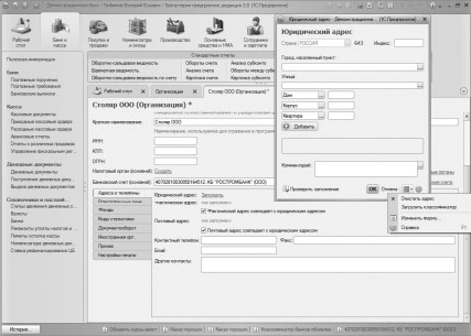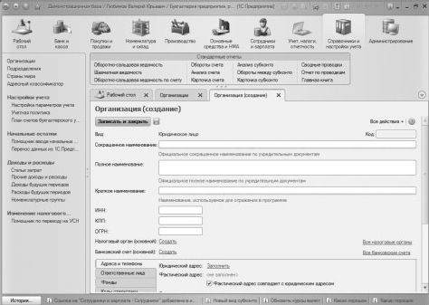Заполняя сведения об организации, мы опускаем ввод некоторых из них. Для нашего учебного примера на данном этапе работы это вполне допустимо, для реального ведения учета вам понадобится ввести гораздо более подробные сведения, которые можно почерпнуть из учредительных документов, из документов о регистрации в налоговых органах и т.д.