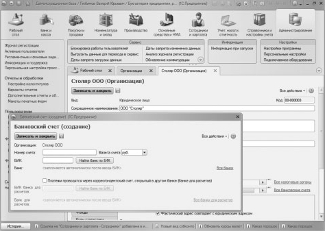 Для того, чтобы в явном виде сохранить объект справочника, мы можем нажать на кнопку Сохранить запись в панели инструментов окна создания объекта, кнопка Записать и закрыть позволяет сохранить объект и закрыть окно его редактирования. В нашем случае объект был автоматически сохранен при создании нового банковского счёта. Дело в том, что до тех пор, пока запись об организации не сохранена в справочнике, система не может сослаться на данную запись в других объектах. Это нужно для создания связей объектов. Например, такая связь установлена между записью о банковском счёте организации и записью об организации.