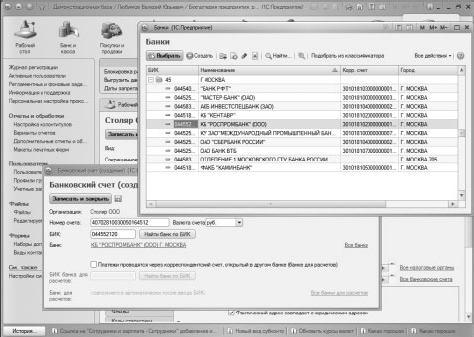 Мы добавляем новую организацию в базу, в которой уже ведется учет. Если вы вводите данные новой организации в новую пустую базу, прежде чем заработает механизм подбора банков по БИК, вам понадобится заполнить справочник Банки . Для того, чтобы перейти к списку элементов этого справочника, можно нажать на кнопку Все банки в форме создания нового счёта, рис. 3.6.