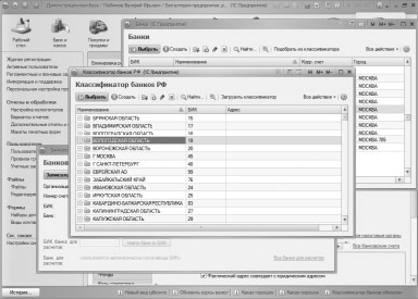 В этом окне достаточно нажать на кнопку Далее , начнется загрузка классификатора. После успешной загрузки классификатора система сообщит об этом, после чего окно загрузки классификатора можно закрыть. Теперь, выделив в окне Классификатор банков РФ нужный банк (или несколько банков, удерживая при выделении клавишу Ctrl , если вы планируете использовать данные по нескольким банкам), можно нажать на кнопку Выбрать . В данном окне, рис. 3.8. для удобства, можно изменить режим просмотра (Все операции > Режим просмотра) , осуществлять поиск банков и настраивать условия отбора.
