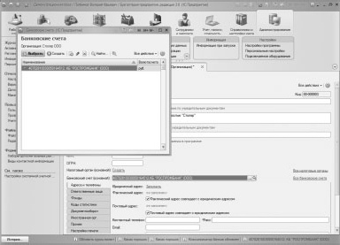 Обратите внимание на то, что теперь банковский счет организации отображается в поле, которое поддерживает выбор значения, в нём указан только что созданный счёт. Данные об этом счете хранятся в справочнике Банковские счета . Если нажать на кнопку с тремя точками, появляется окно для выбора счёта. У организации может быть несколько счетов, данные по всем этим счетам хранятся в вышеупомянутом справочнике. При вызове данного окна (и других подобных) в них отображаются только записи, имеющие отношение к редактируемому объекту. В нашем случае – банковские счета организации, данные по которой мы вводим в систему.