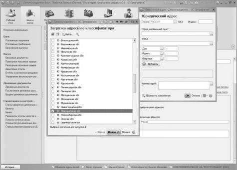 Обратите внимание на то, что мы нажали на кнопку Все операции , которая расположена в нижней части данного окна и в появившемся меню имеется команда Загрузить классификатор . В новых пустых базах адресный классификатор не загружен, в демонстрационной базе загружен классификатор города Москвы. Выполнение команды загрузки классификатора приводит к вызову окна, рис. 3.12., в котором нужно выбрать регионы для загрузки адресного классификатора.