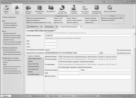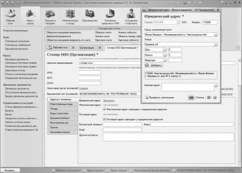 После нажатия на кнопку ОК в окне заполнения адреса введенный адрес будет перенесен в карточку организации, так как установлены флаги, указывающие на то, что почтовый адрес и фактический адрес совпадают с юридическим адресом, будут заполнены еще несколько реквизитов. Если эти адреса различаются, флаги нужно снять и указать необходимые адреса. В итоге мы пришли к виду карточки организации, показанному на рис. 3.18.