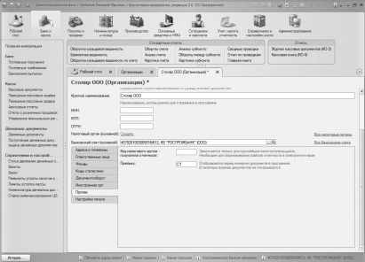 На закладке Коды статистики нужно ввести информацию о кодах, присвоенных организации при регистрации (ОКОПФ, ОКФС, ОКВЭД, ОКПО), здесь вам следует воспользоваться учредительными документами.
