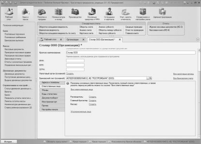 Закладка Ответственные лица , рис. 3.20., позволяет при создании карточки организации указать список её ответственных лиц. В частности, здесь приведены ссылки для создания записей об основных ответственных лицах – руководителе, бухгалтере и кассире.
