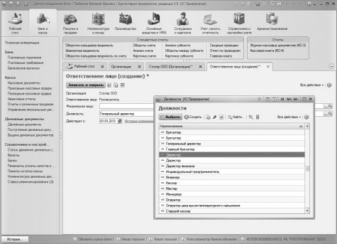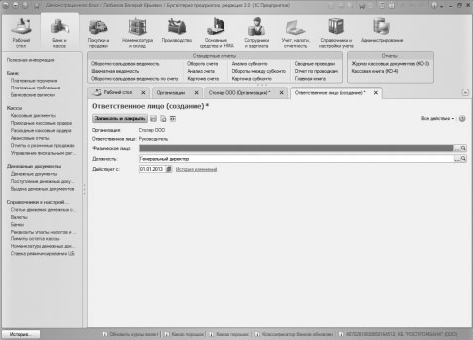 Для создании записи об ответственном лице нужно нажать на ссылку Создать у соответствующего реквизита. Будет открыто окно Ответственное лицо , рис. 3.21., где уже заполнены реквизиты Организация и Ответственное лицо ( Руководитель , в данном случае). В этом окне нам нужно указать дату вступления ответственного лица в должность (01.01.2013), должность и физическое лицо, которое занимает данную должность.