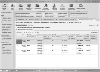 Данный документ оказывает воздействие на учёт, формирует движения по регистрам, поэтому мы можем просмотреть эти движения, воспользовавшись кнопкой Показать проводки и другие движения документа . Нажав на эту кнопку, мы видим окно со сведениями о движениях документа, рис. 4.5.