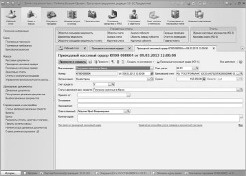 Основные документы по учету денежных средств в кассе – это Приходный кассовый ордер и Расходный кассовый ордер . На рис. 4.6. вы можете видеть Приходный кассовый ордер , которым отражается получение наличных денежных средств в банке.