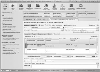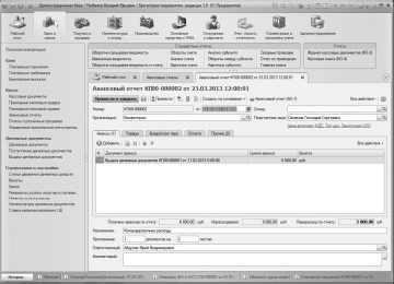 Перерасход по авансовому отчету составил 3000 рублей – об этом можно узнать из итоговых показателей в нижней части документа. Печатная форма документа, вызываемая кнопкой Авансовый отчет (АО-1) позволяет сформировать авансовый отчет по унифицированной форме № АО-1. На основании документа можно ввести несколько документов. Например, если по отчёту зафиксирован перерасход средств, что означает, что сотрудник потратил собственные средства, затраченные средства могут быть выданы ему из кассы или перечислены на его банковский счёт, для чего можно ввести на основании авансового отчета соответствующий банковский или кассовый документ. В нашем случае, рис. 4.9., сделана запись о перерасходе вида Д26 К71.