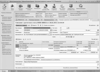 В форме документа Списание с расчетного счёта , рис. 4.4., указывается его связь с соответствующим ему платежным поручением, заполняются соответствующие реквизиты. На основании этого документа можно создать документы Платежное поручение, Счет-фактура выданный и Счет-фактура полученный . При вводе сведений о хозяйственных операциях в 1С: Бухгалтерии вполне возможны изменения последовательности ввода некоторых документов. Например, если говорить об обычном хронологическом порядке выполнения действий, сначала формируется платежное поручение, оно передаётся банку, банк исполняет его, передаёт в организацию выписку, на основании выписки вводится документ Списание с расчетного счёта . Но вполне возможна ситуация, когда сначала в систему вводятся сведения о факте списания, а потом, для экономии времени, на основании документа Списание с расчетного счета выполняется создание документа Платежное поручение .