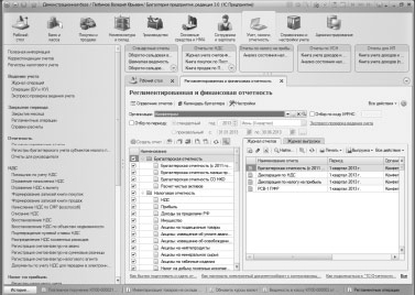 Для создания регламентированной отчетности служит ссылка Регламентированные отчеты в группе Отчетность. Она открывает окно Регламентированная и финансовая отчетность , рис. 4.42. Здесь, в левой части окна, приведен список отчетов, в правой, на закладке Журнал отчетов , имеются записи об уже сформированных отчетах. Здесь можно видеть несколько отчетов за 1-й квартал 2013 года.