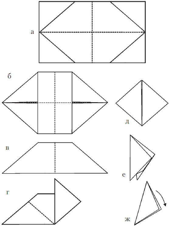 Потом требуется согнуть несвязанные уголки ромба к вершине так, чтобы получился треугольник (рис. 4 д, е). Затем следует опять переложить изделие таким образом, чтобы из треугольника получился ромб (рис. 4 ж).
