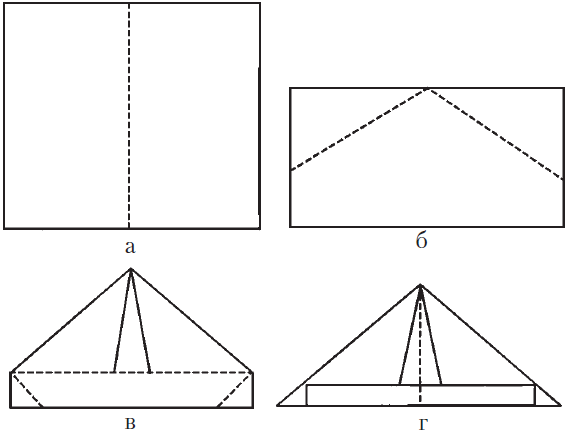 Вариант 1. Для того чтобы сделать лодочку, понадобится лист бумаги прямоугольной формы. Вначале надо согнуть его пополам (рис. 4 а).