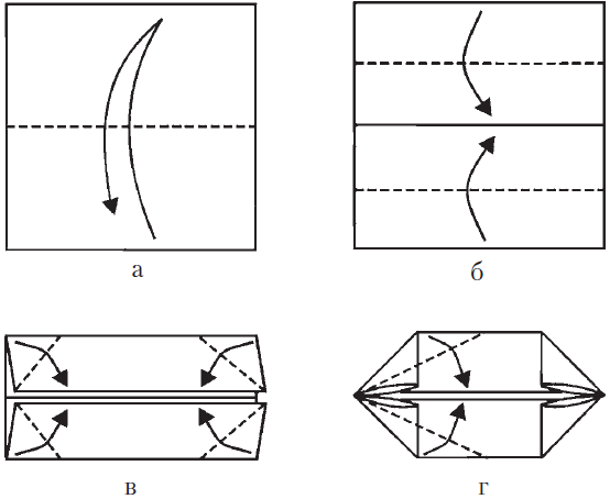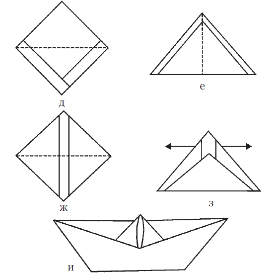 Вариант 2. Начинать изготовление лодочки следует со складки, которую в оригами принято называть «дверь» (рис. 5 а, б). Затем у лодочки сгибают внутрь все 4 уголка, как показано на рис. 5 в, г. Далее складывать фигурку надо так, как это показано на схеме (рис. 5 д, е).